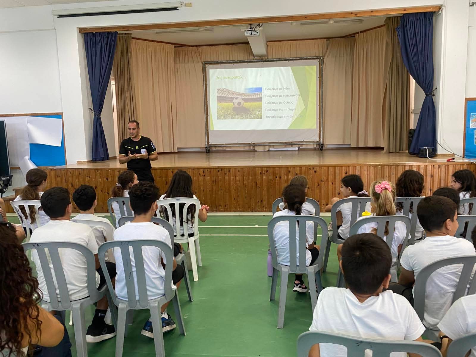 Σήμερα είχαμε τη χαρά να φιλοξενήσουμε στο σχολείο μας τον κ. Κυριάκο Παπλωματά, διαιτητή της ΚΟΠ. Ο κ. Κυριάκος μίλησε στα παιδιά για το fair play δίνοντας ιδιαίτερη έμφαση στο πόσο σημαντικό είναι ο αθλητής/ποδοσφαιριστής να συμπεριφέρεται στον αντίπαλο με σεβασμό, να αποφεύγει τη βία και το αντιαθλητικό παιχνίδι και να διασφαλίζει τη σωματική ακεραιότητα όλων. Στη συνέχεια εξήγησε στα παιδιά τους κανονισμούς του ποδοσφαίρου. Μετά τα παιδιά χωρίστηκαν σε ομάδες και αγωνίστηκαν μεταξύ σε ποδοσφαιρικούς αγώνες, τους οποίους διαιτήτευσαν ο κ. Κυριάκος και ο κ. Λούκας.
