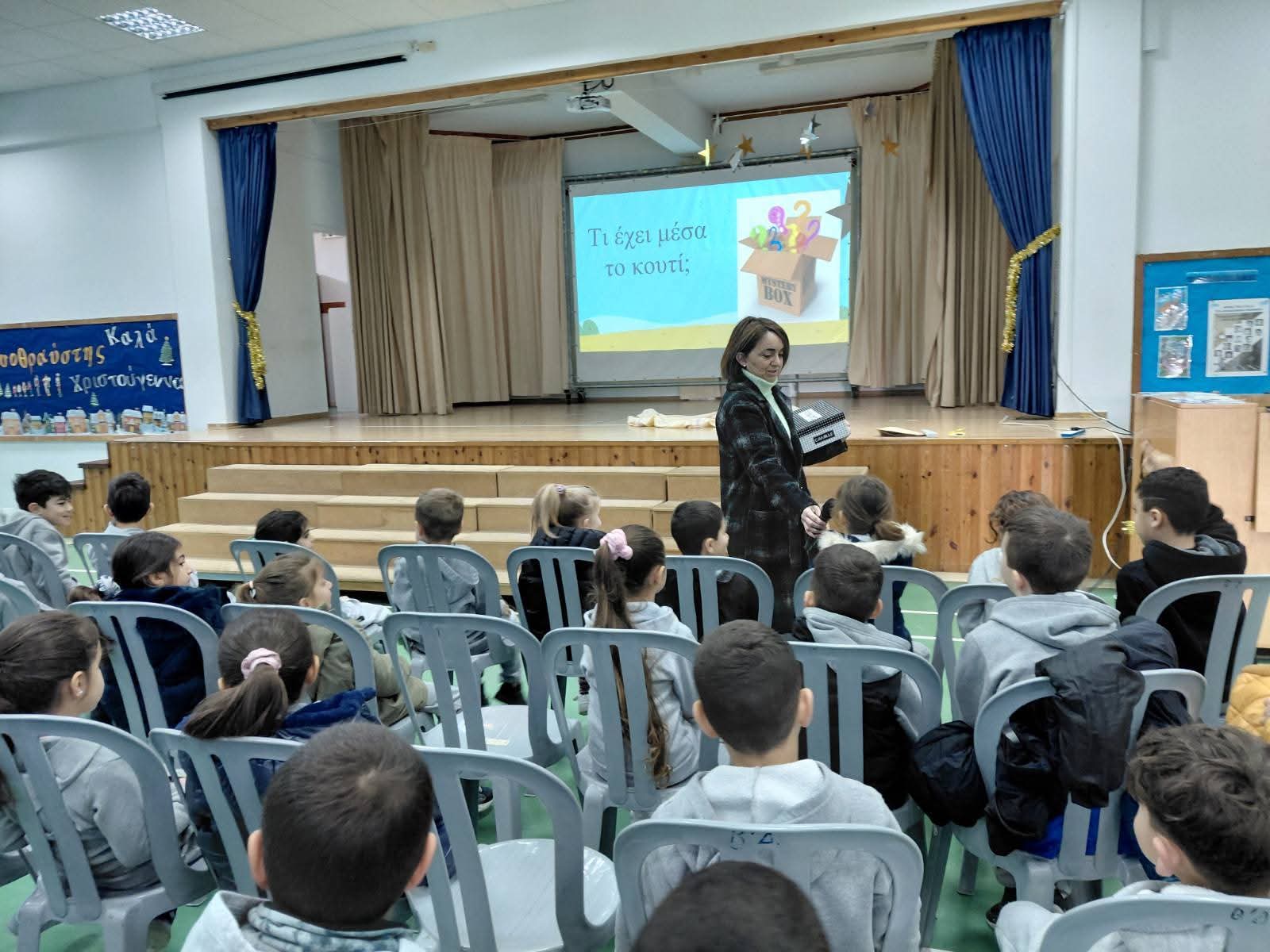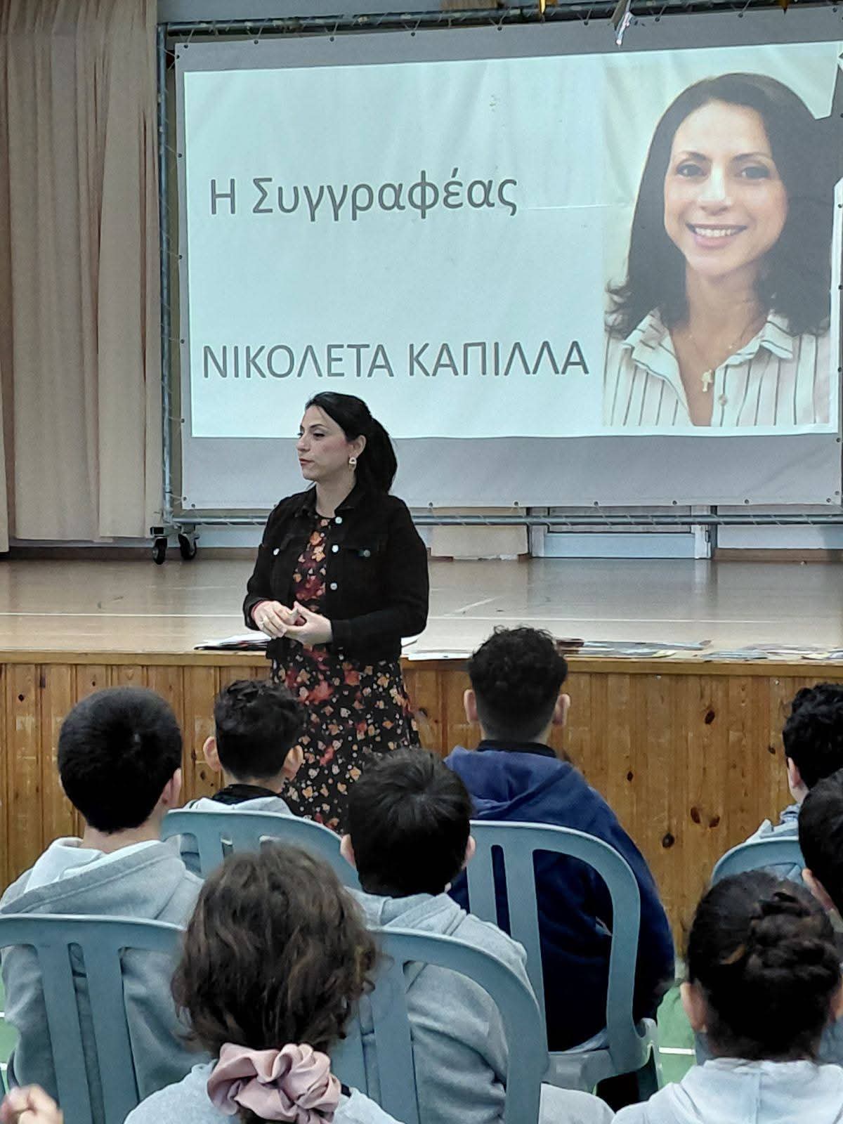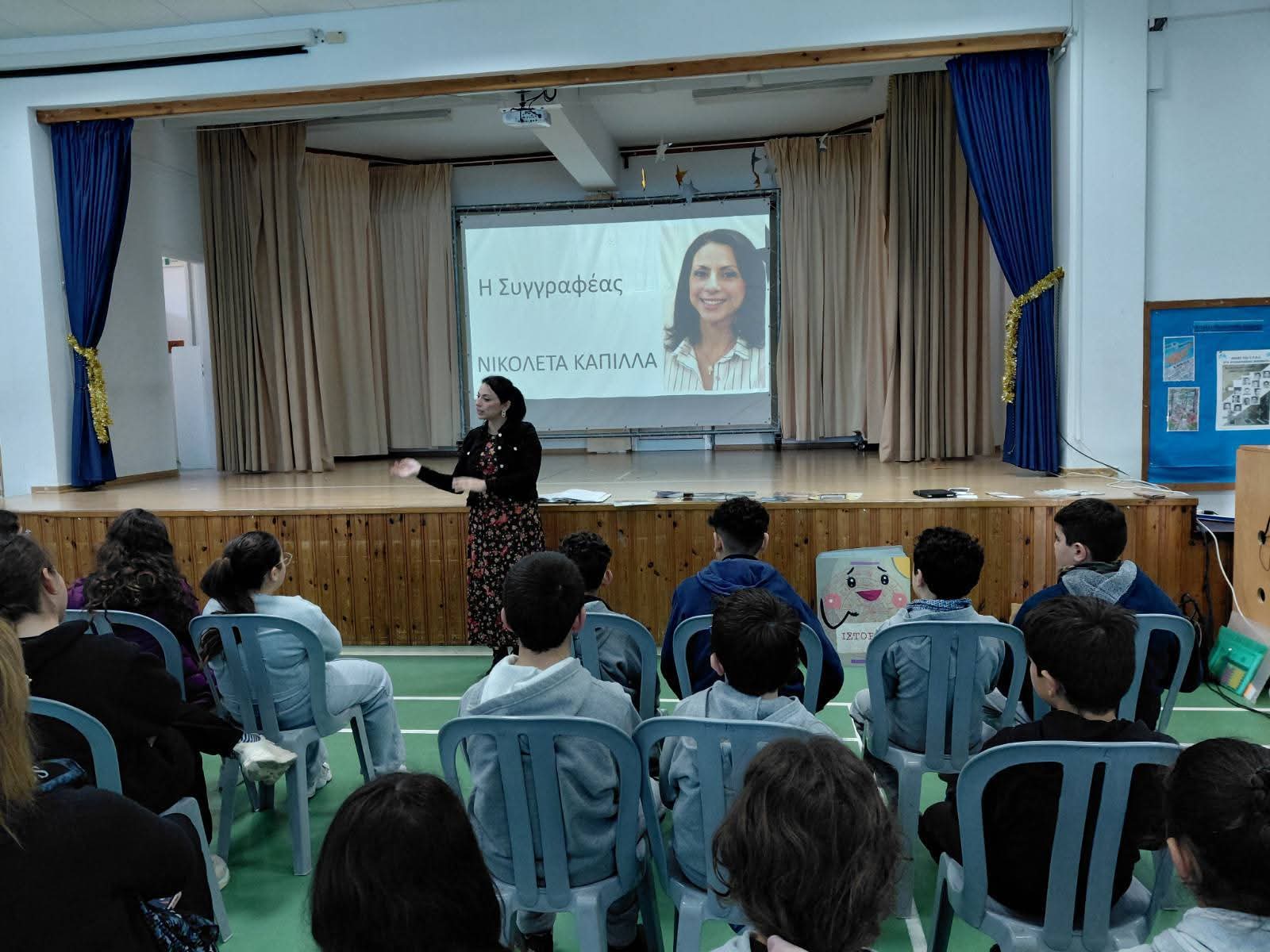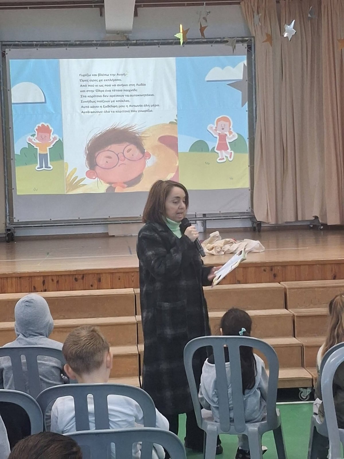 Η συγγραφέας παρουσίασε στα παιδιά της Α’ , Β΄ και Γ’ τάξης το παραμύθι της «Μυστήριο στην παιδική χαρά». Μέσα από διαδραστικές δραστηριότητες τα παιδιά έμαθαν πώς ένας συγγραφέας μπορεί να αντλήσει έμπνευση και να γράψει ιστορίες από φαινόμενα που συμβαίνουν στη φύση, από το ζωικό βασίλειο καθώς και διάφορα γεγονότα που μπορούν να βιώσει ο ίδιος κατά τη διάρκεια της ζωής του. Ακολούθως, τα παιδιά έπαιξαν ένα παιχνίδι, όπου τα ίδια έγιναν «ντετεκτιβ» και έφτιαξαν ιστορίες με βάση κρυμμένα αντικείμενα που ανάκάλυψαν.Τα παιδιά ενθουσιάστηκαν από το βιβλίο, τις δραστηριότητες και την αμεσότητα