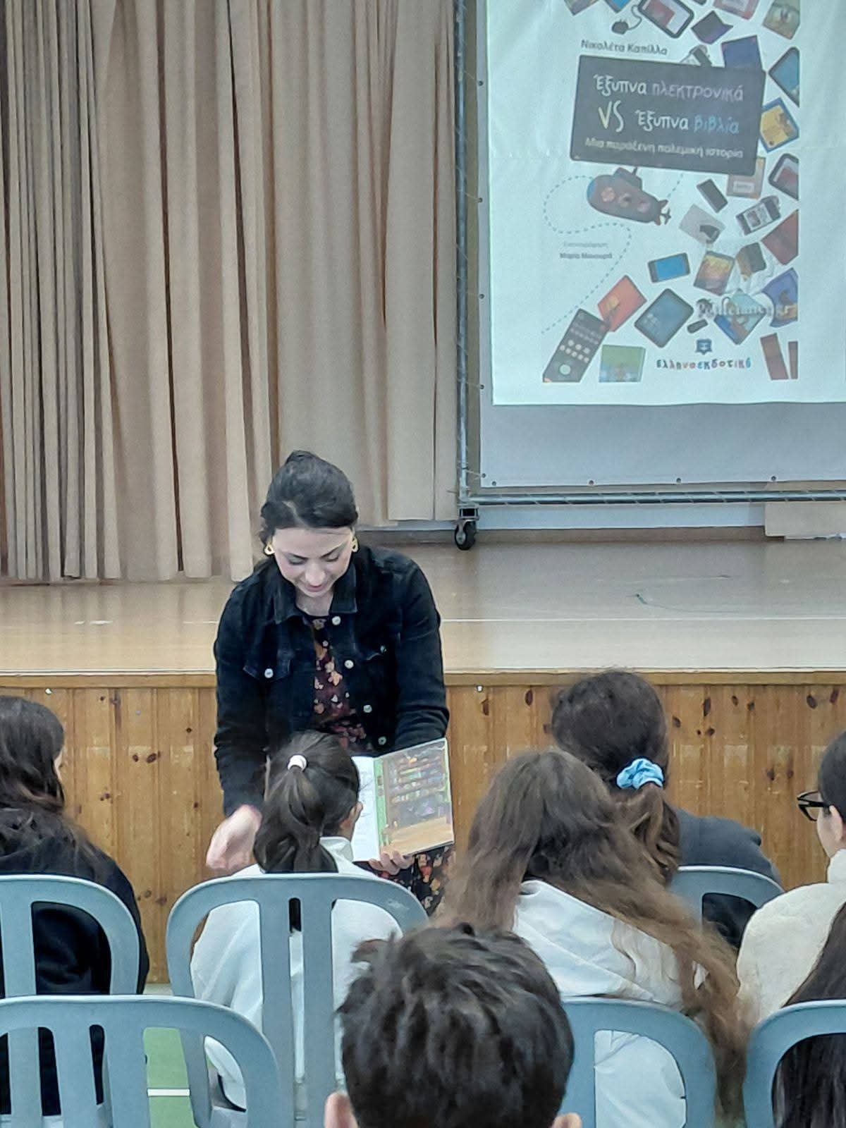 Σήμερα επισκέφτηκε το σχολείο μας η εκπαιδευτικός και συγγραφέας Νικολέττα Καπίλλα, η οποία παρουσίασε στα παιδιά των Δ’ , Ε΄ και Στ’ τάξεων το βιβλίο της «Έξυπνα ηλεκτρονικά VS Εξυπνα βιβλία". Τα παιδιά πήραν μέρος σε ένα debate που αφορούσε τη διαμάχη μεταξύ Ηλεκτρονικών και Έντυπων βιβλίων. Στη συνέχεια, μέσα από διαδραστικές δραστηριότητες πρότειναν τρόπους, ώστε τα βιβλία να επιστρέψουν στα χέρια των ανθρώπων, που είναι διαρκώς απασχολημένα με το κινητό, το τάμπλετ ή το τηλεκοντρόλ της σμαρτ τιβί!