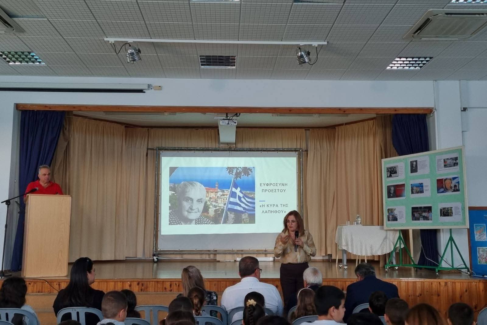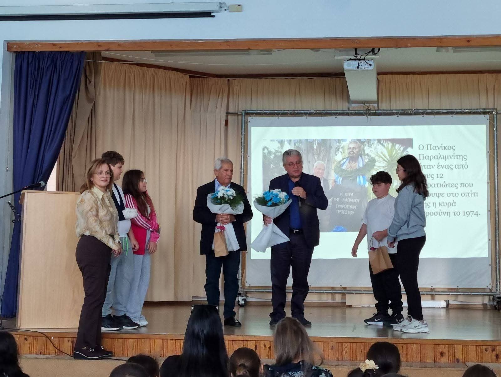 Σήμερα είχαμε την τιμή να φιλοξενήσουμε στο σχολείο μας τον κ. Γιάννη Νικολάου, πρώην διευθυντή ειδήσεων του ΡΙΚ και τον κ. Πανίκκο Παραλιμνίτη, ένα από τους στρατιώτες που έκρυψε και φρόντισε η κ. Ευφροσύνη Προεστού, η γυναίκα που έμεινε γνωστή στην ιστορία ως "Κυρά της Λαπήθου".