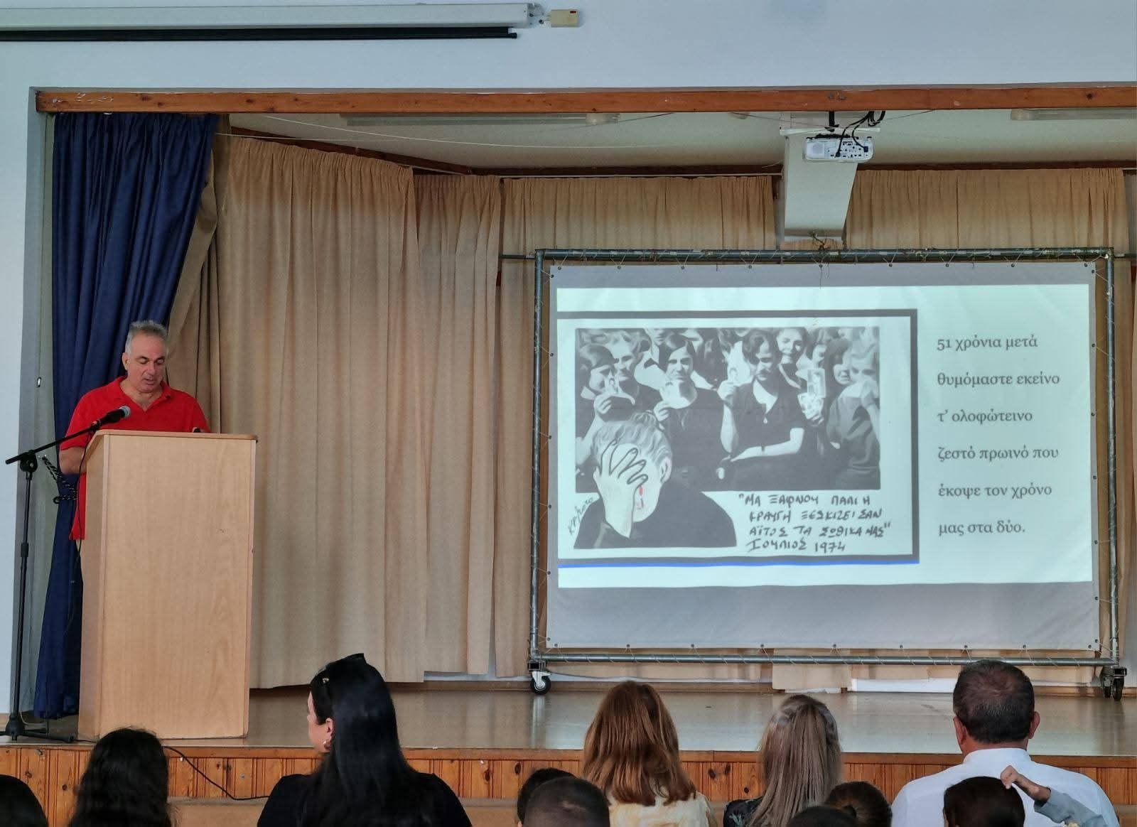 Μέσα στα πλαίσια του στόχου "ΔΕΝ ΞΕΧΝΩ" , είχαμε τη χαρά να φιλοξενήσουμε την Τρίτη 12 Νοεμβρίου στο σχολείο μας τον εκπαιδευτικό κ. Δημήτρη Κυριάκου, ο οποίος μας μίλησε για τα βιώματα του ως έφεδρος αξιωματικός κατά τη διάρκεια της τουρκικής εισβολής του 1974. Στη συνέχεια μίλησε στους μαθητές μας για τον τρόπο λειτουργίας των σχολείων τον πρώτο καιρό μετά την εισβολή.
