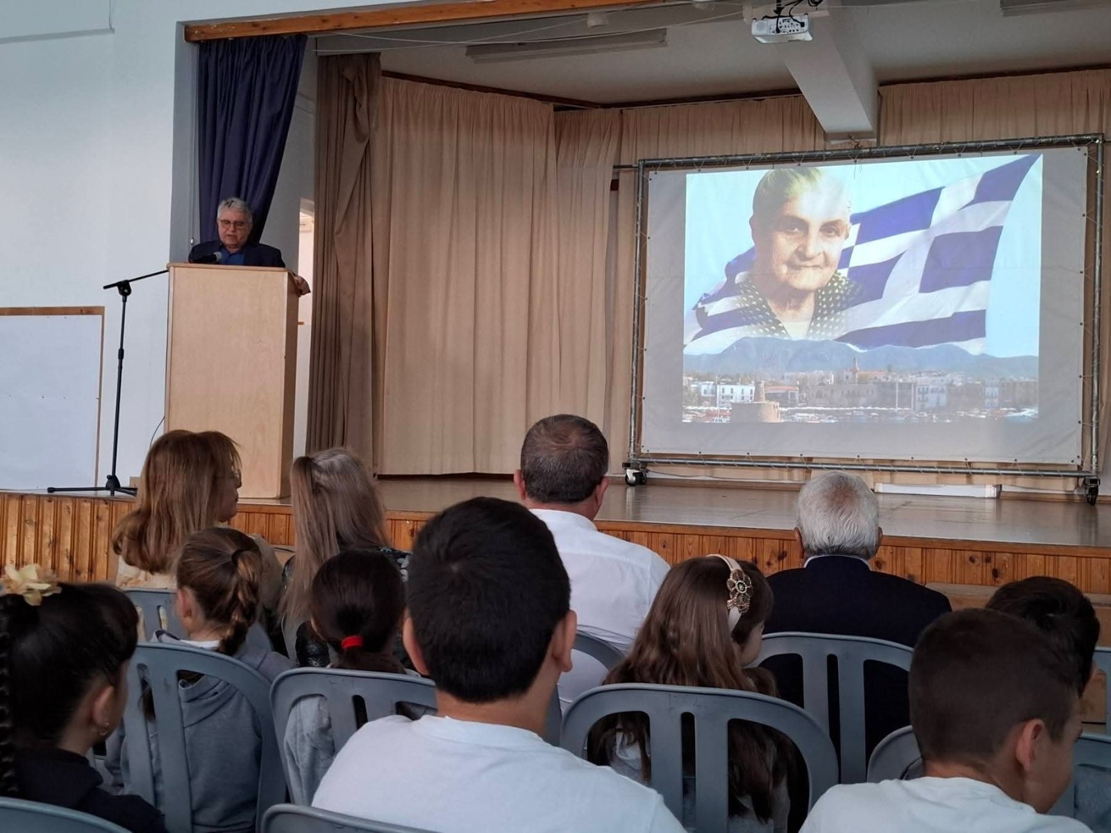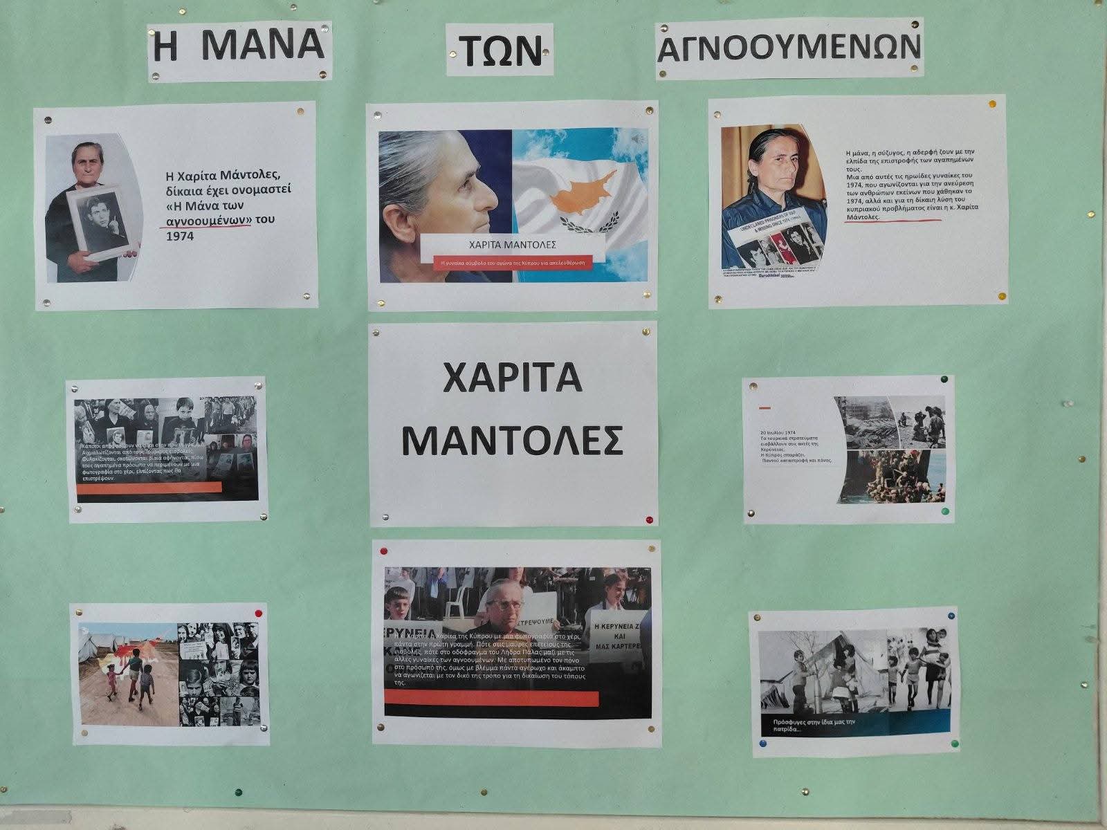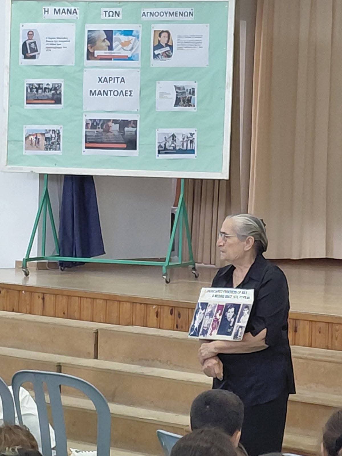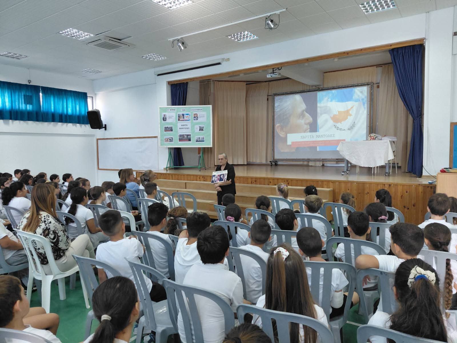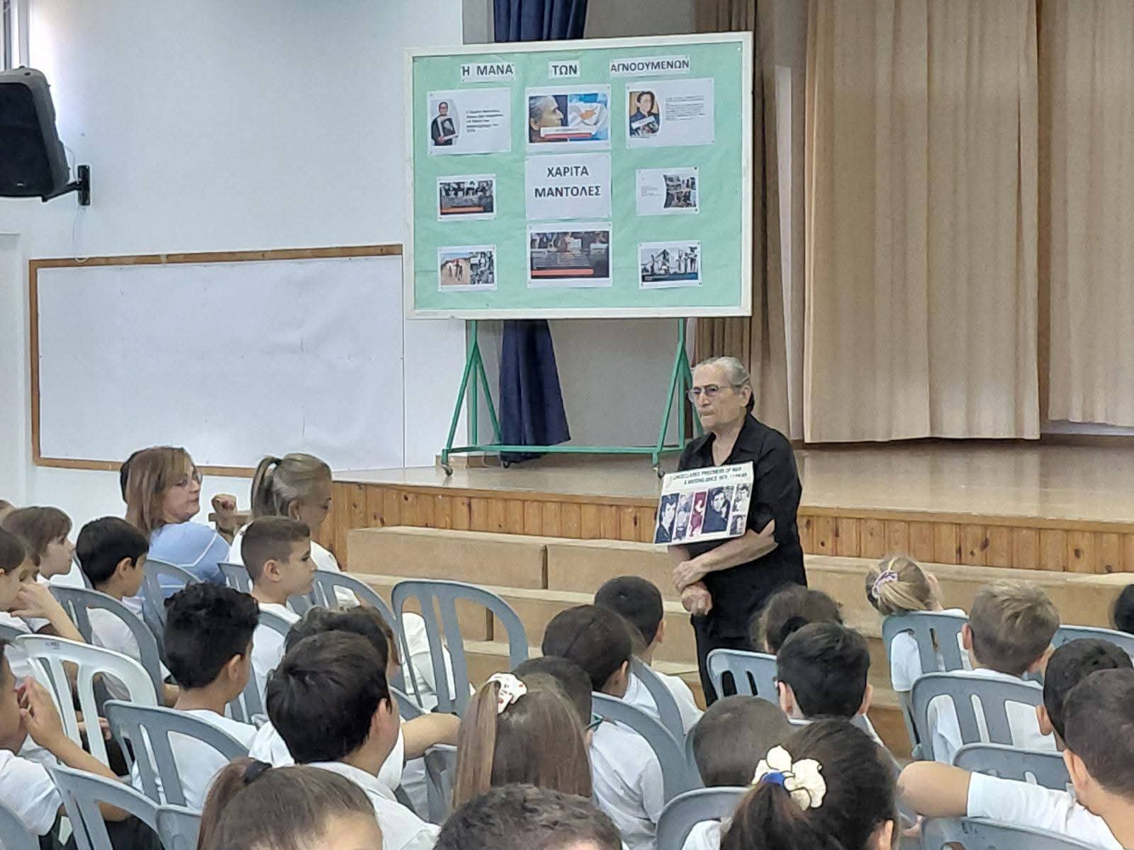 Την Τετάρτη 12 Νοεμβρίου είχαμε την τιμή να φιλοξενήσουμε στο σχολείο μας την κ. Χαρίτα Μάντολες, που με τα λόγια της μας συγκλόνισε όλους. Η γυναίκα σύμβολο για την υπόθεση των αγνοουμένων της Κύπρου, μας αφηγήθηκε τη φοβερή εμπειρία της σύλληψης και εν ψυχρώ εκτέλεσης του συζύγου της, του πατέρα της, των δύο γαμπρών της και άλλων οκτώ συγχωριανών της στο χωριό Ελιά της Κερύνειας, στη διάρκεια της τουρκικής εισβολής τον Ιούλιο του 1974. Η εξιστόρηση της καθήλωσε και συγκίνησε τα παιδιά, που όπως μας δήλωσαν δεν θα ξεχάσουν ποτέ όσα άκουσαν!
