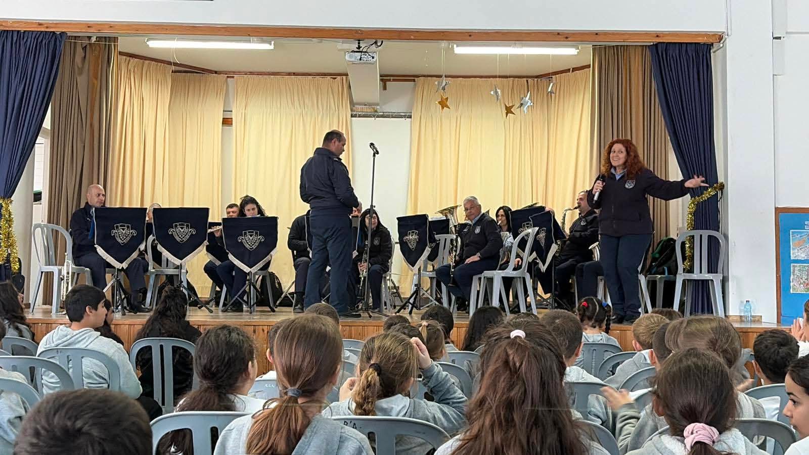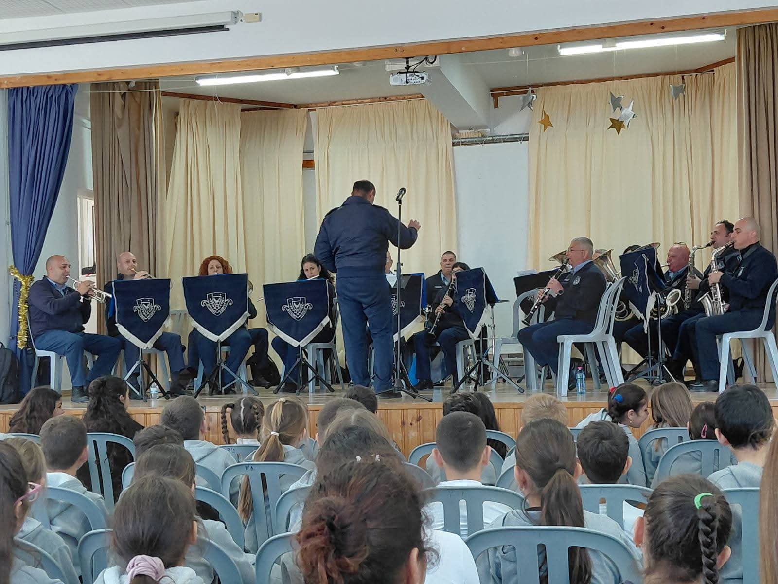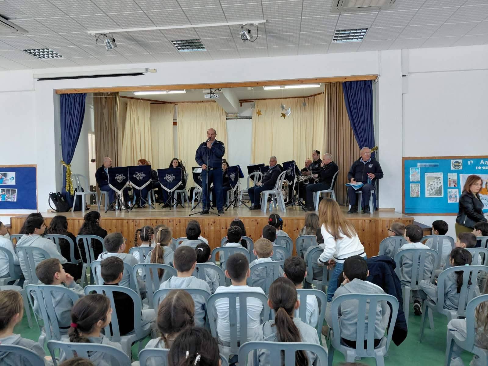 Σήμερα, Δευτέρα 9 Μαρτίου, είχαμε τη χαρά να φιλοξενήσουμε στο σχολείο μας τη Φιλαρμονική Ορχήστρα Αστυνομίας Κύπρου. Αφού παρουσίασαν στα παιδιά τα μουσικά όργανα, (ξύλινα και χάλκινα πνευστά, και κρουστά) έπαιξαν όμορφες μελωδίες, δίνοντας μια μικρή συναυλία, στην οποία τα παιδιά συμμετείχαν με κέφι και ενθουσιασμό! Παράλληλα οι μαθητές ενημερώθηκαν για το ανθρωπιστικό έργο της Φιλαρμονικής που είναι παρούσα σε όποια φιλανθρωπική, εθνική και εκπαιδευτική εκδήλωση προσκληθούν.